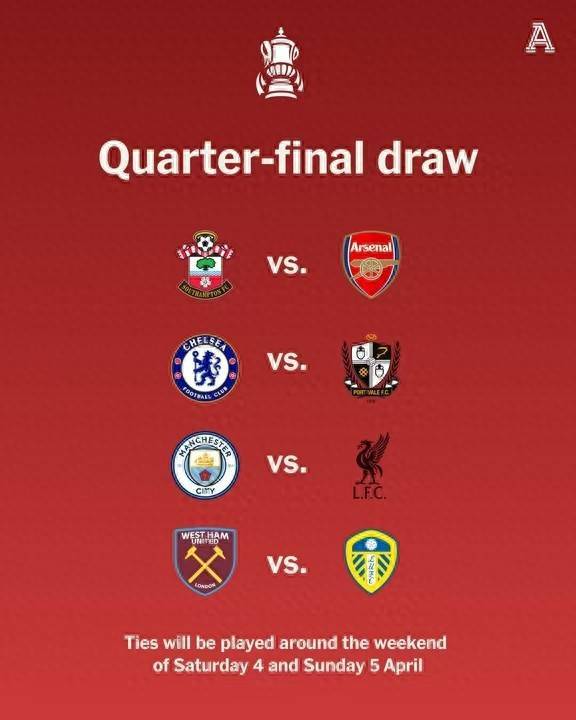 足总杯1/4决赛对阵:曼城vs利物浦 枪手vs圣徒 蓝军vs英甲副班长